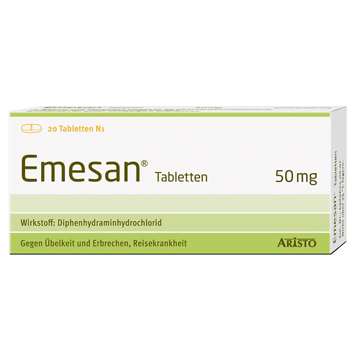 Der Wirkstoff Diphenhydramin wirkt zweifach gezielt an den Rezeptoren. Er blockiert die Rezeptoren des Botenstoffs Histamin direkt im Gleichgewichtsorgan und im Brechzentrum. Auf diese Weise wird Übelkeit, Schwindel und Brechreiz unterdrückt. Zudem wirken die Emesan® Tabletten beruhigend und Schlaf fördernd.